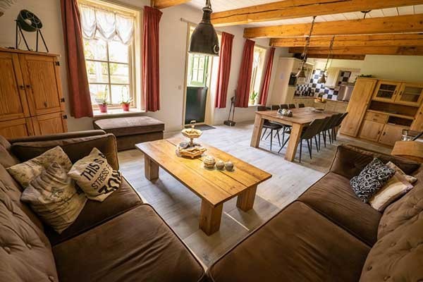 Die Ferienwohnung De Ossenstal befindet sich in einem Teil des ehemaligen Stalls und verfügt über ein Obergeschoss auf dem früheren Strohlager. Die großzügige Ferienwohnung ist für bis zu zehn Personen geeignet und besitzt eine eigene Terrasse im liebevoll angelegten Garten. Im Erdgeschoss befindet sich ein großer Wohnbereich mit offener Küche, ausgestattet mit vollständiger Küchenausstattung, Fünf-Flammen-Kochfeld, Geschirrspüler und Kombi-Backofen. Die Sitzecke mit Fernseher bietet viel Raum zum gemeinsamen Entspannen. Im Obergeschoss stehen drei Schlafzimmer sowie ein Badezimmer mit Badewanne, Duschkabine und Toilette zur Verfügung. Die Schlafaufteilung besteht aus einem Doppelbett, zwei Einzelbetten sowie einem Zimmer mit Etagenbetten und Ausziehbett.