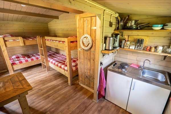 Im Obstgarten des Hofes steht eine großzügige Wanderhütte mit viel Freiraum rundherum. Die Wanderhütte ist für vier Personen eingerichtet und verfügt über Etagenbetten, einen Esstisch, eine kleine Küche mit Kühlschrank und elektrischen Kochplatten sowie über Terrassentüren, die direkt auf die eigene Terrasse mit Picknicktisch führen. Die sanitären Einrichtungen befinden sich im Bauernhaus und sind von der Wanderhütte aus bequem erreichbar.